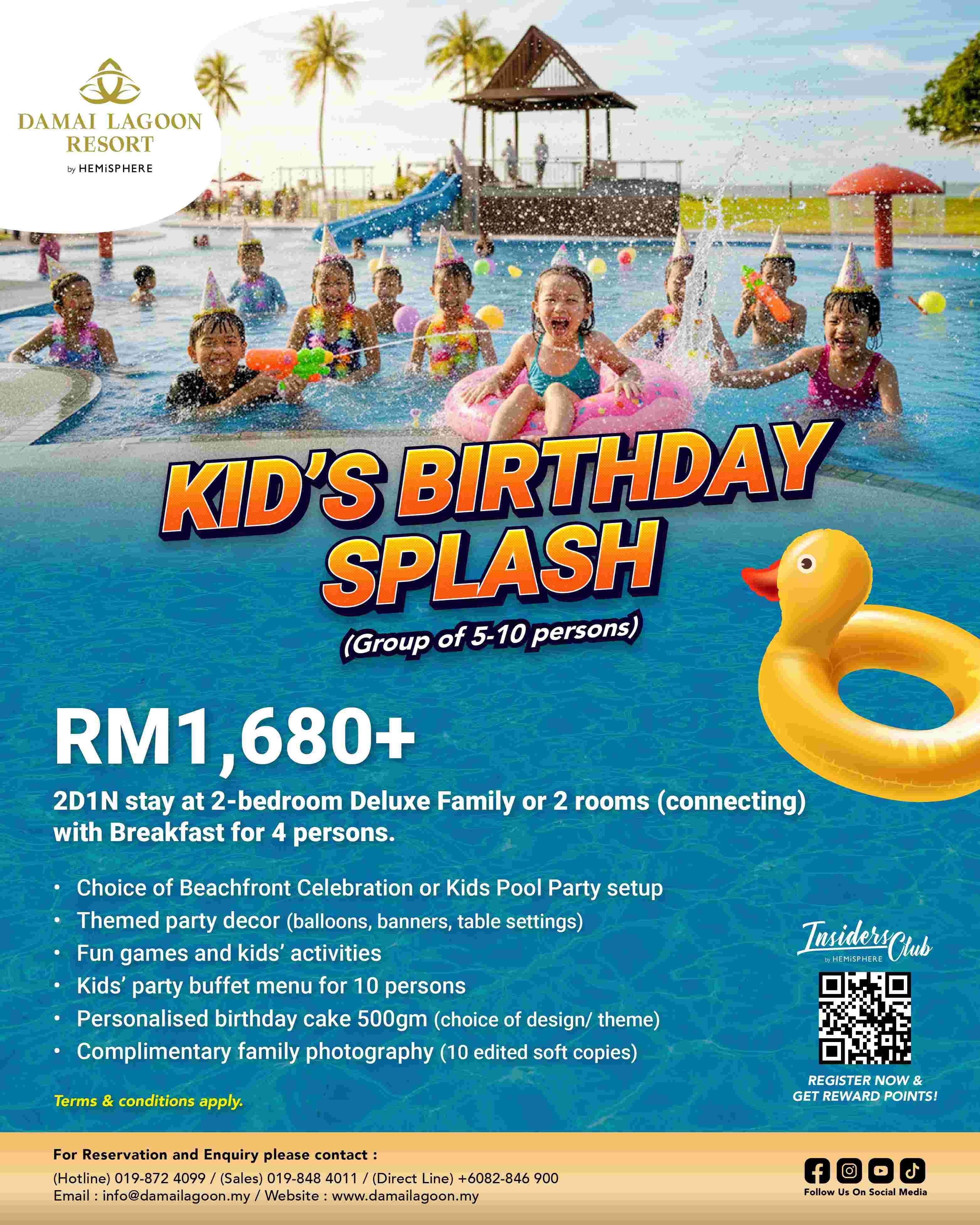 Turn your child’s birthday into the ultimate poolside celebration! With our Kid’s Birthday Splash package at Damai Lagoon Resort, your little one and their friends will dive into hours of fun, laughter, and excitement. From making a splash in the pool to enjoying a cozy family stay in our spacious rooms, every detail is crafted to make their special day truly unforgettable.